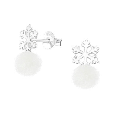 Snowflake - 925 Sterling Silver pom pom Ear Studs