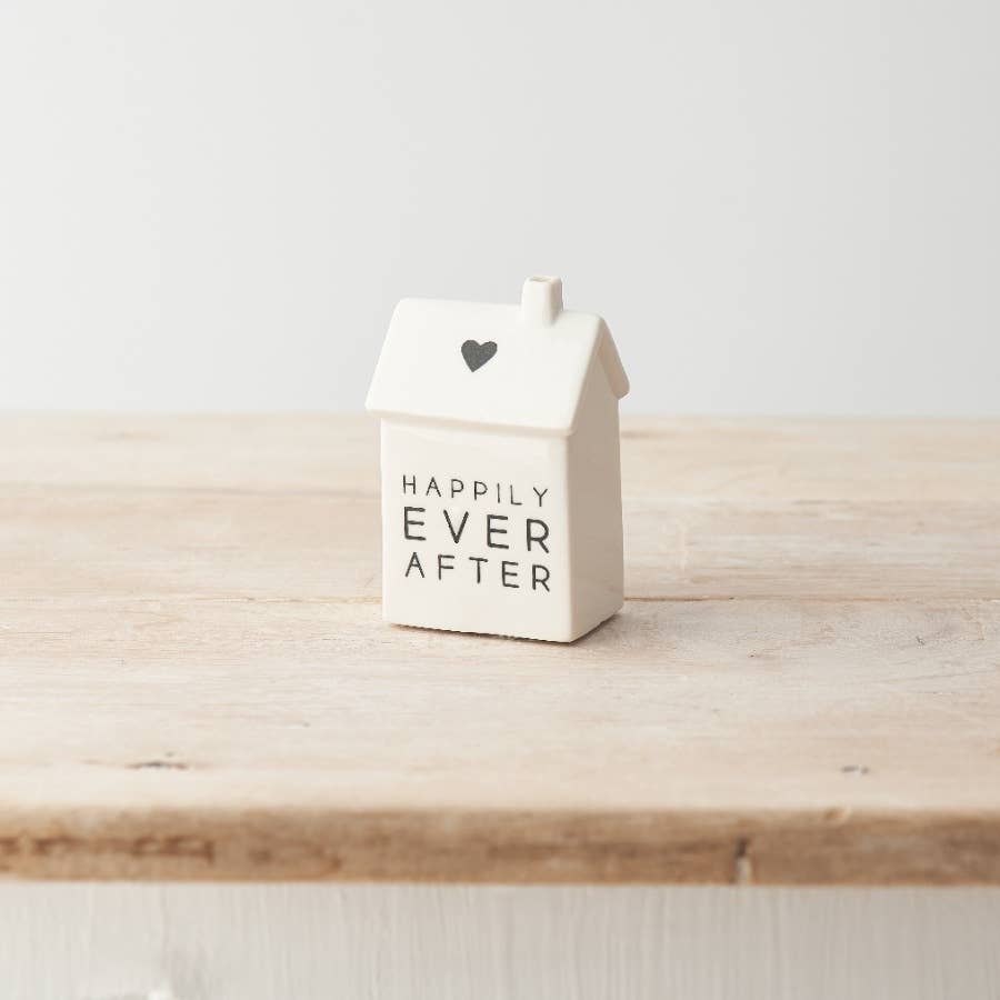 A simple yet stylish porcelain house decoration with "happily every after" message alongside a cute heart motif.