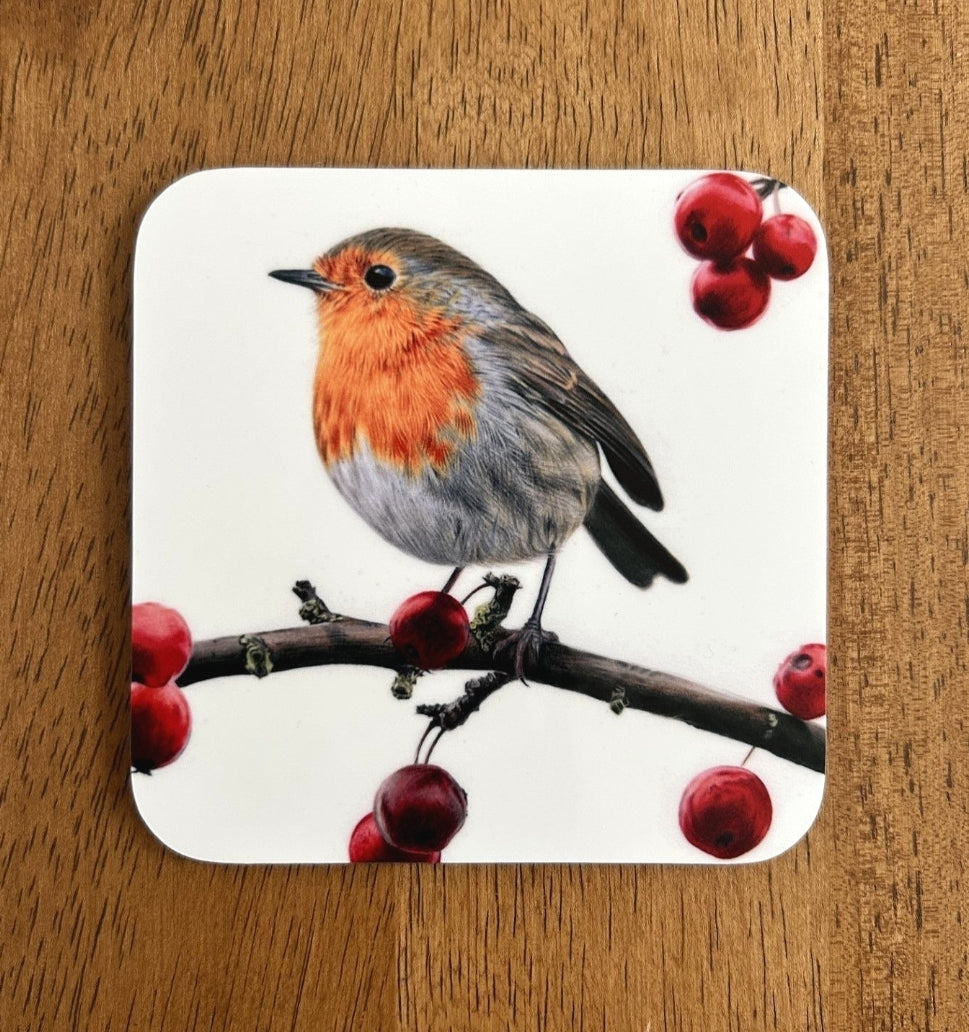 High gloss coaster with ‘Christmas Robin’ artwork printed on.