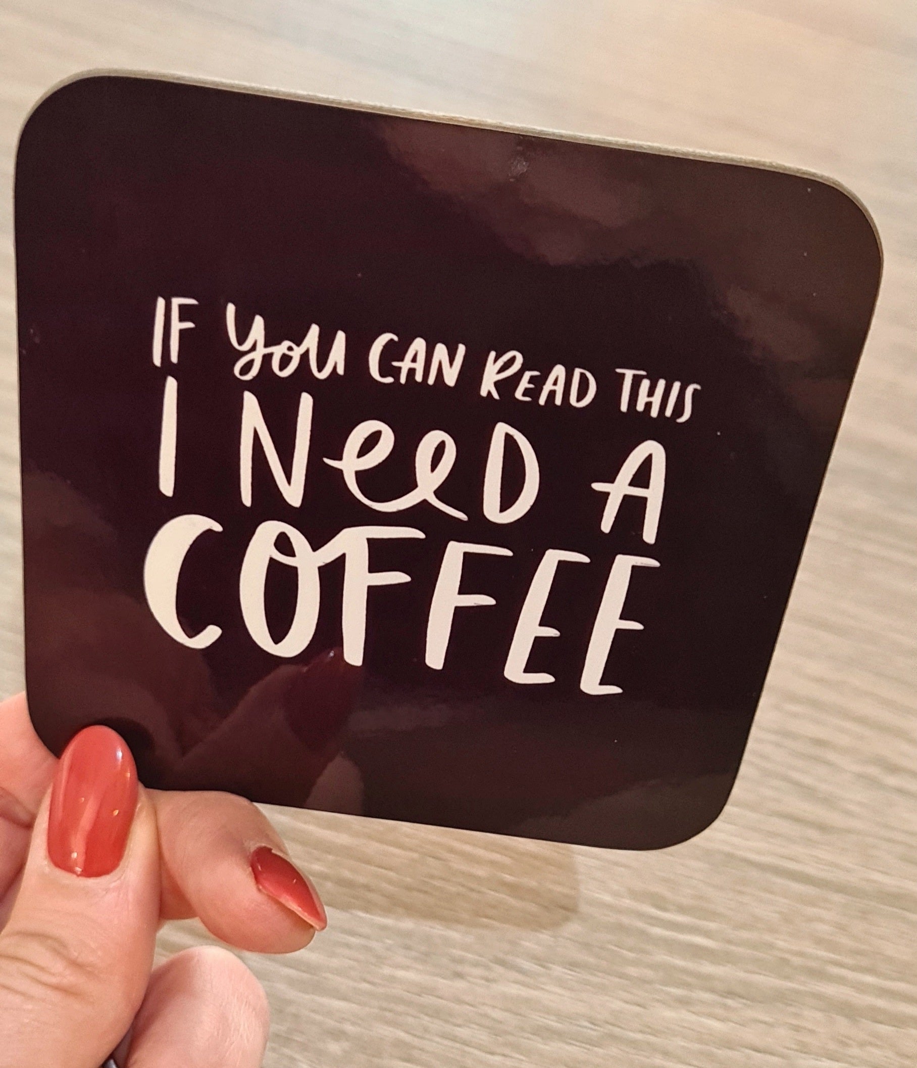 Reads "if you can read this I need a coffee" in our signature hand-lettered style on a sturdy 9cm x 9cm coaster
