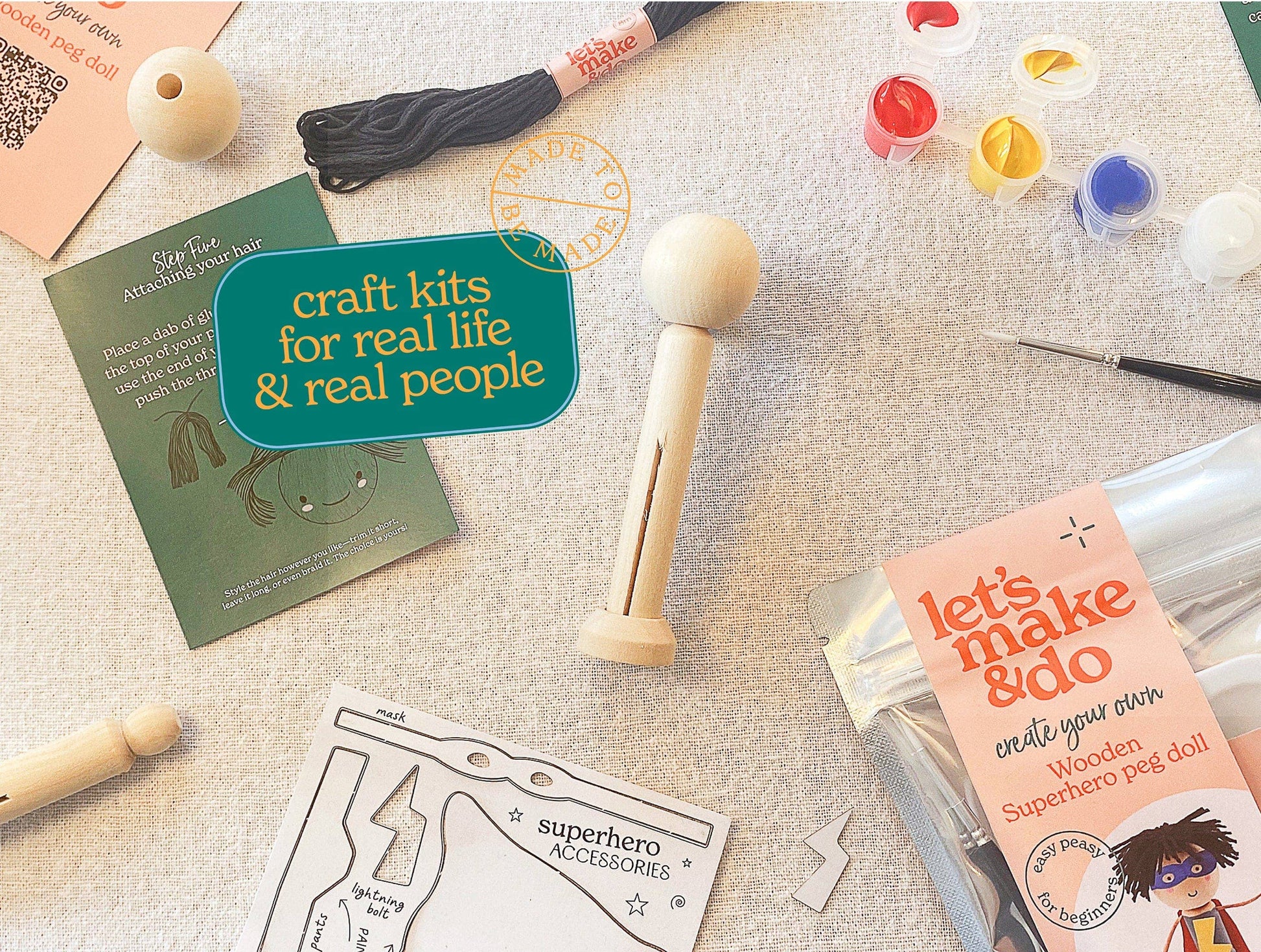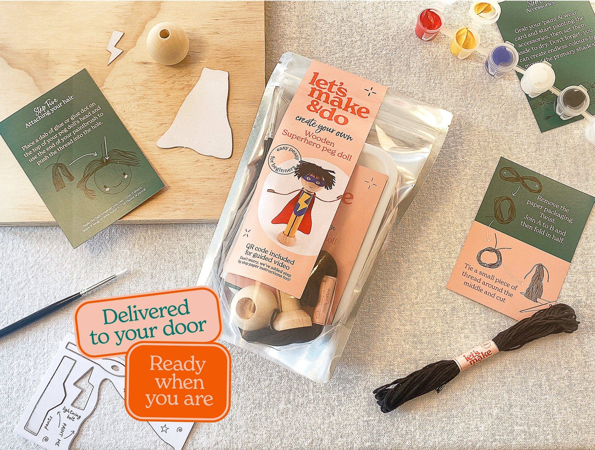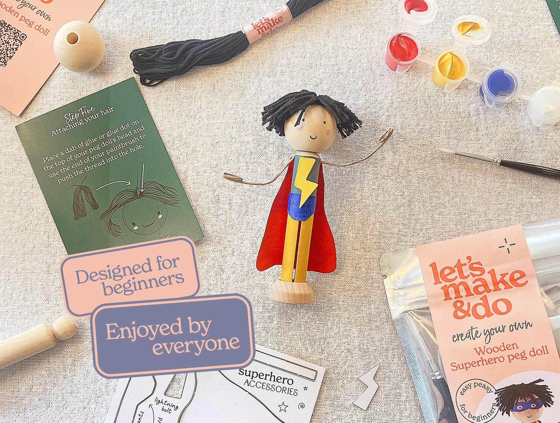 Bring their own superhero to life with this action-packed Superhero Peg Doll Kit, a creative, all-in-one activity designed for imaginative play and mindful making. With a QR code to a guided video tutorial and easy, illustrated instructions, it’s perfect for beginners and brilliant for keeping kids entertained at home, at parties, or on rainy days. Perfect for a thoughtful gift, screen free activity or a hit in any party bag. Includes... - Wooden peg doll & stand - Wooden bead - Paper covered wire - 100% cotton thread - Primary coloured acrylic paints (perfect for mixing your own shades) - High quality paint brush - Mixing palette - Glue & glue dots - Paper accessories (perforated, super easy to pop out when finished) - Recycled paper instructions (with beautiful illustrations) - Step by step QR code video Finished size: H11 x W3cm Warning: Not suitable for under 36 months. Use under adult supervision.