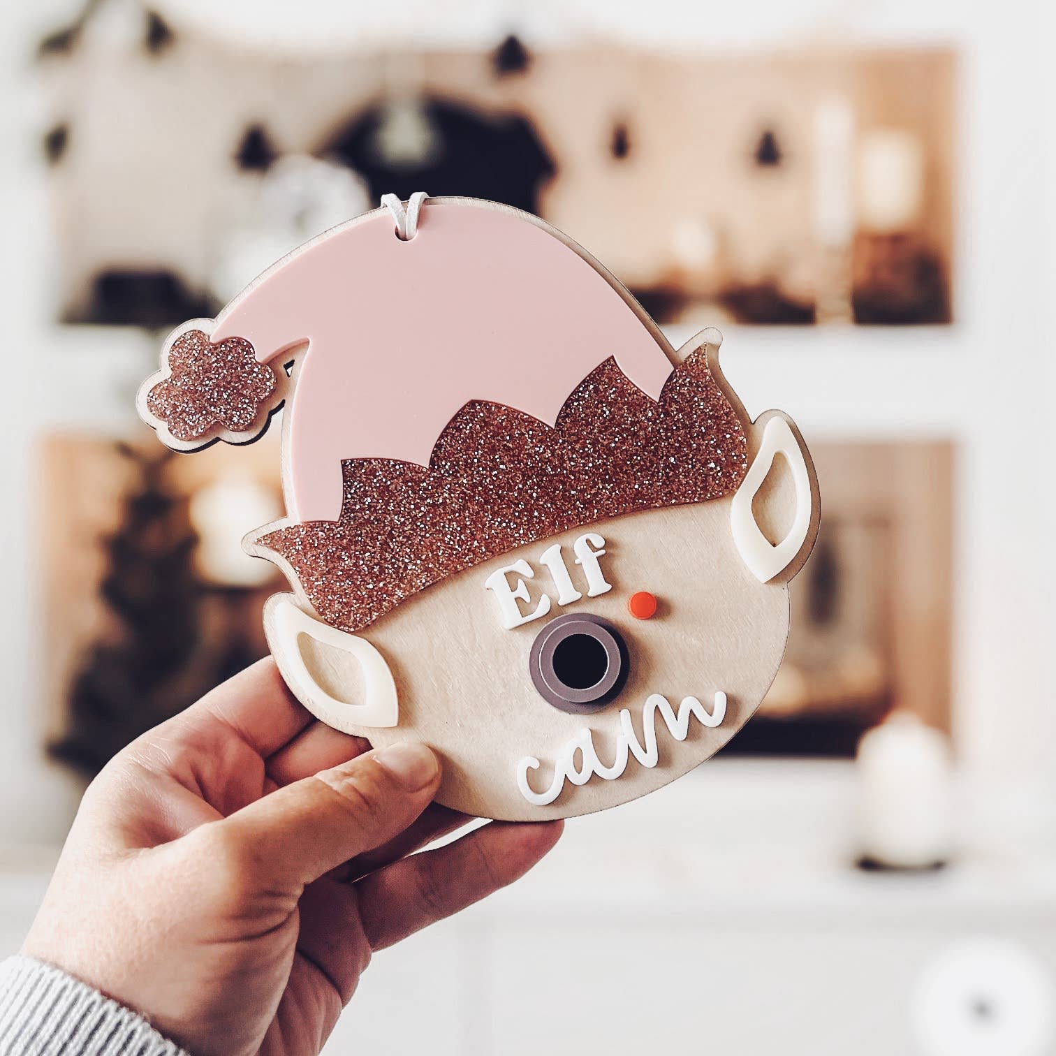 Made from high quality birch plywood and gloss acrylic, our Elf surveillance cam decoration measures approximately 6 inches high and comes with suede cord attached.
