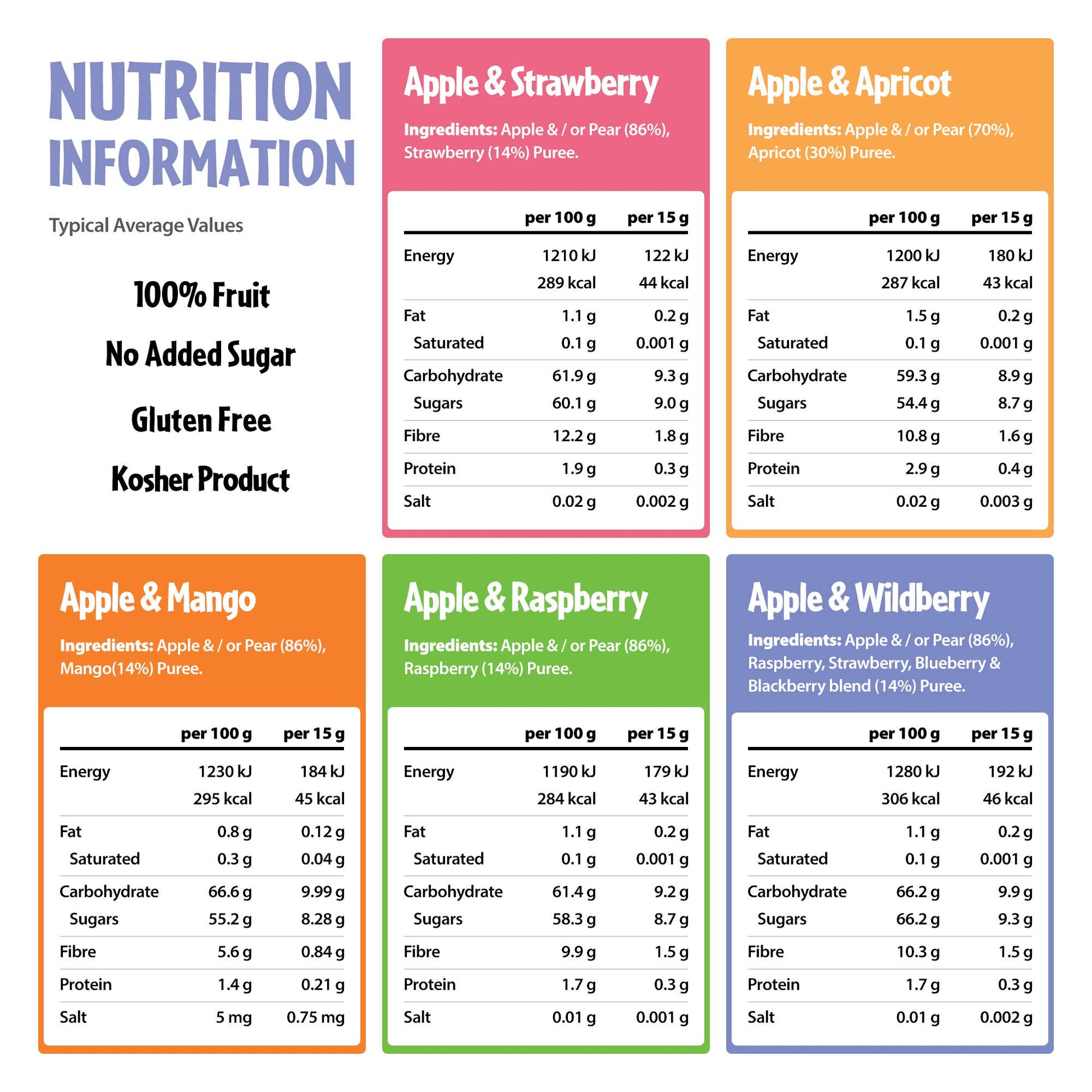 The Fruit Bars come in 5 Mouthwatering and Delicious Flavours: Strawberry, Apricot, Apple Raspberry, Wildberry. Mango, you will get 12 of each,