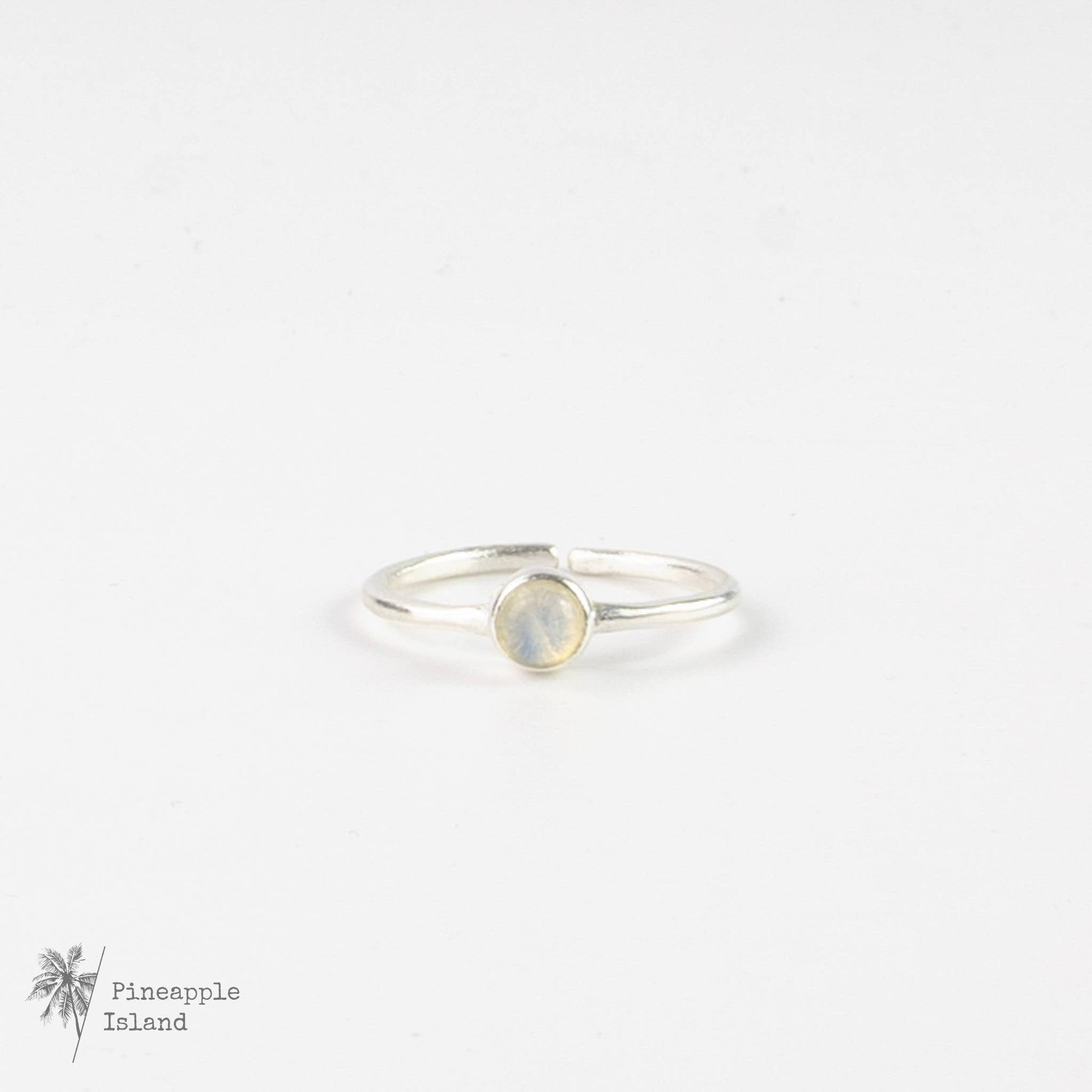 This simple and sleek gemstone ring features a round stone set on an adjustable stacking band.
