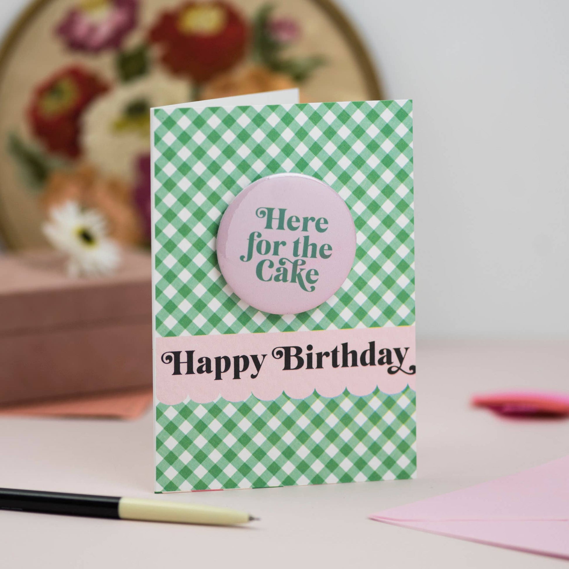 'Here for the Cake' Birthday Badge Card: Cellophane
