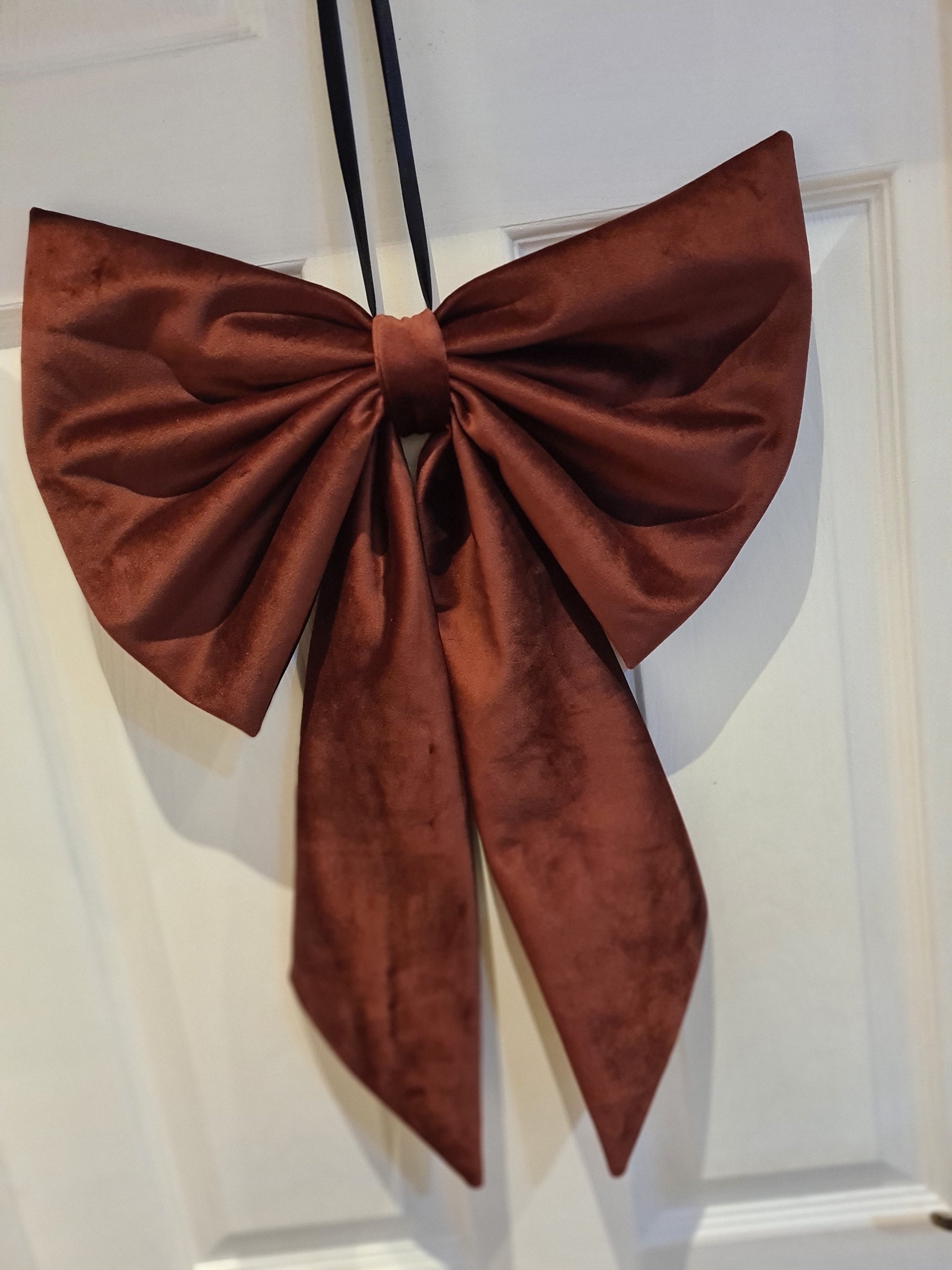 This is a large decorative bow made of soft velvet fabric in a rich burgundy color.