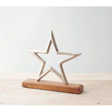 A simplistic metal heart silver ornament, featuring a sweet little bird, placed on a neutral wooden base. Perfect to add a rustic, country style feel to your living space.