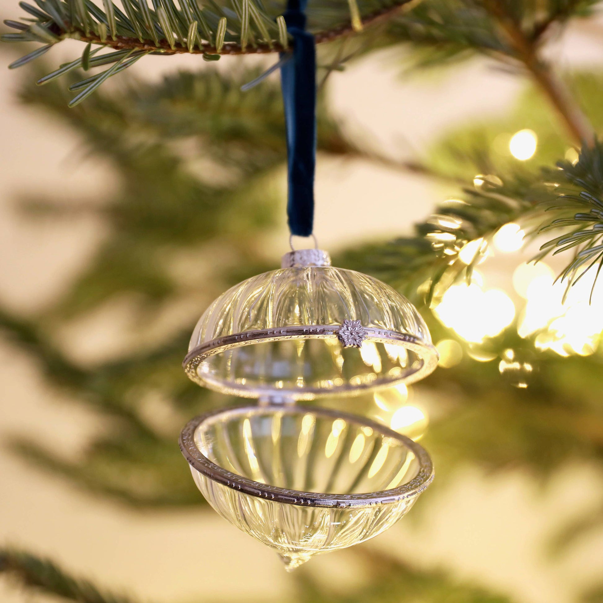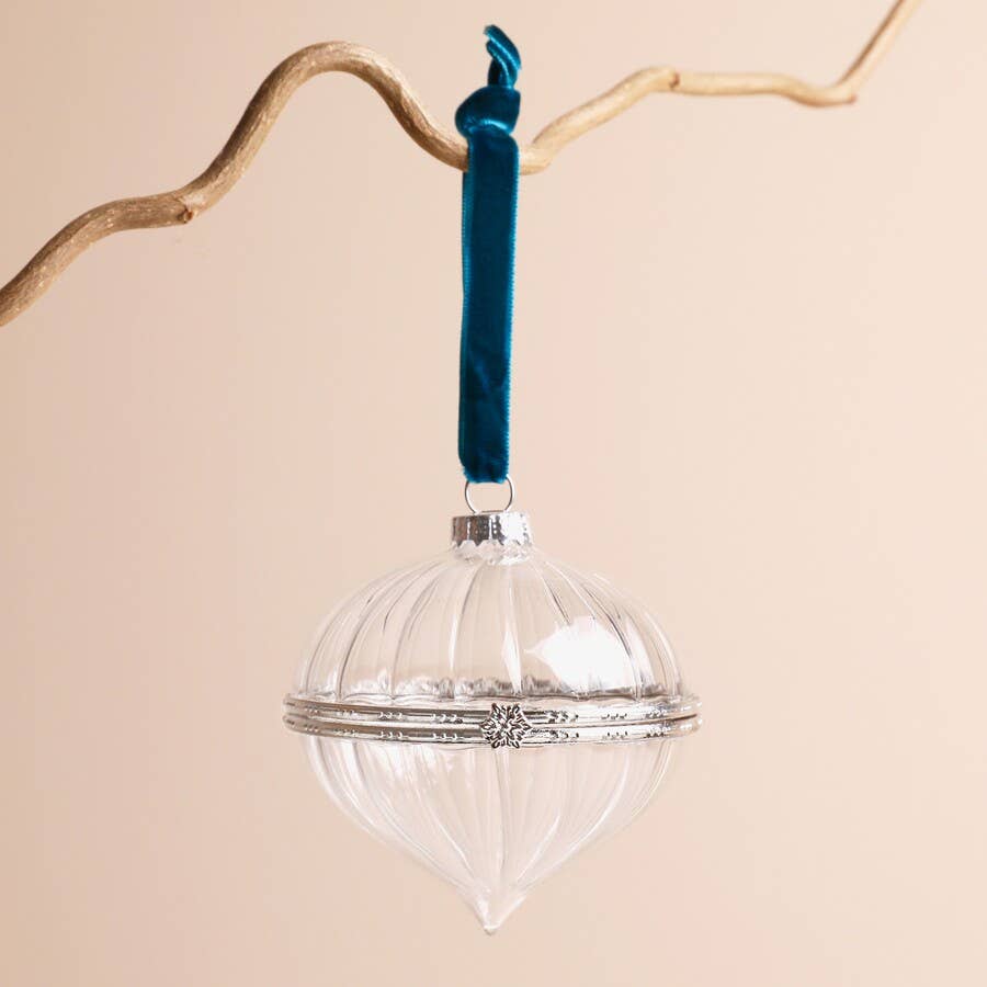 Ribbed Glass Secret Opening Bauble with Navy Ribbon