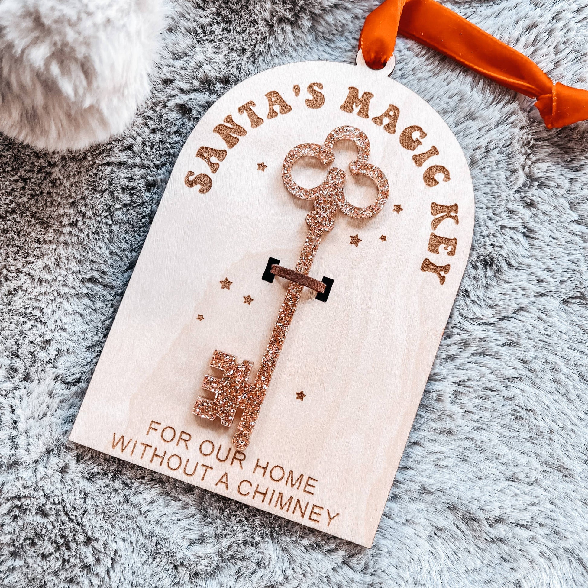 Made from birch plywood and gloss glitter acrylic, our decoration is beautifully engraved with the words "Santa's magic key" "For our home without a chimney".