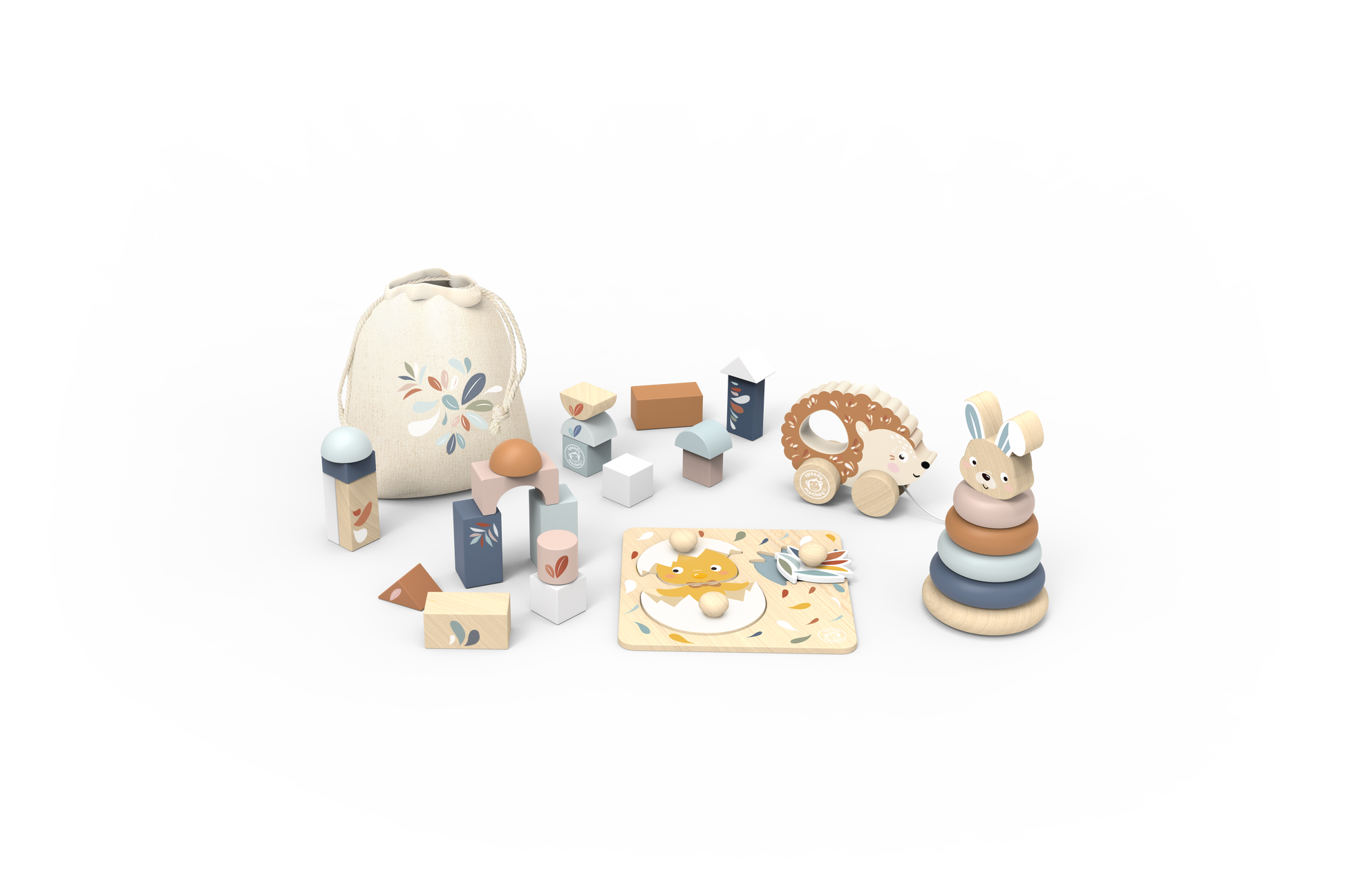 Includes buildings blocks with fabric pouch, stacking rabbit, chick puzzle and pull-along hedgehog.