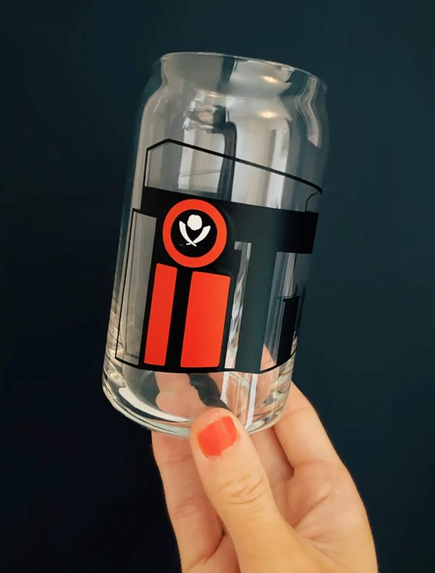 Can Shaped Glass of Sheffield United’s Stadium. Printed in Sheffield. Handwash only, not microwave or dishwasher safe.