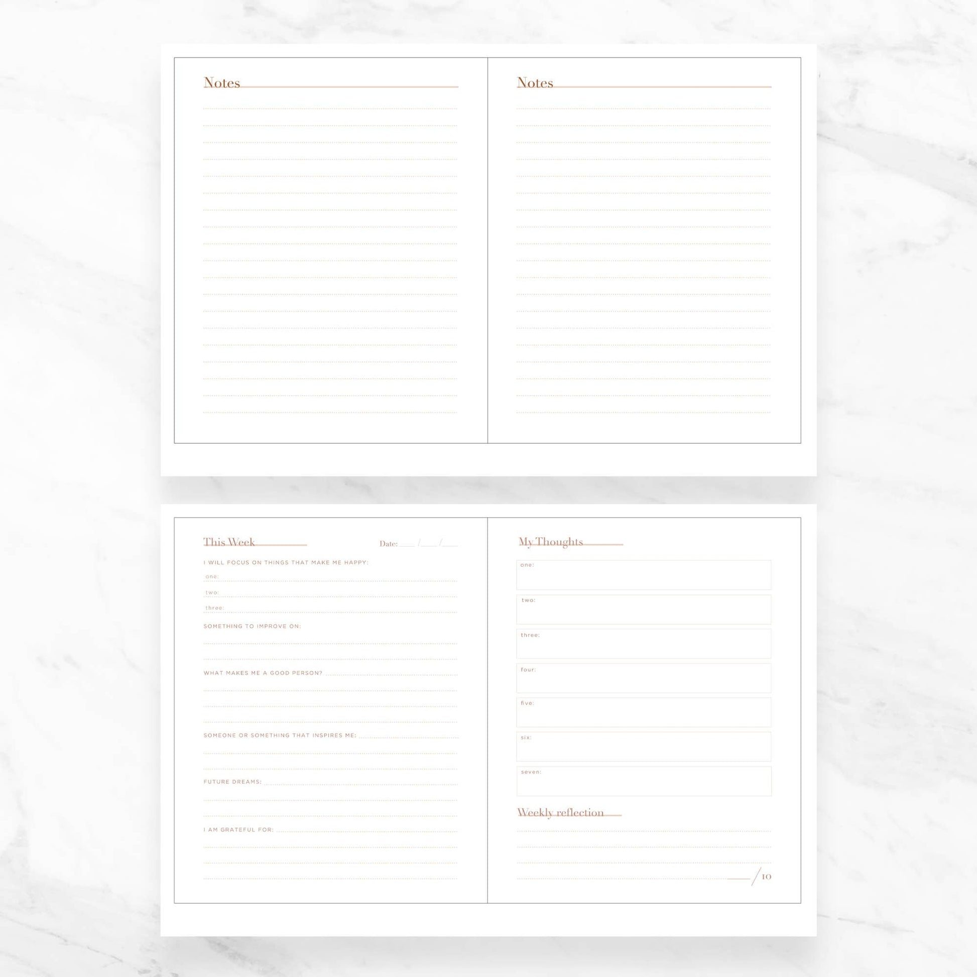 This mindful journal is an exclusive way to nurture yourself, providing weekly focus on what makes you happy, what to improve on, and what makes you a good person, as well as someone or something that inspires you.
