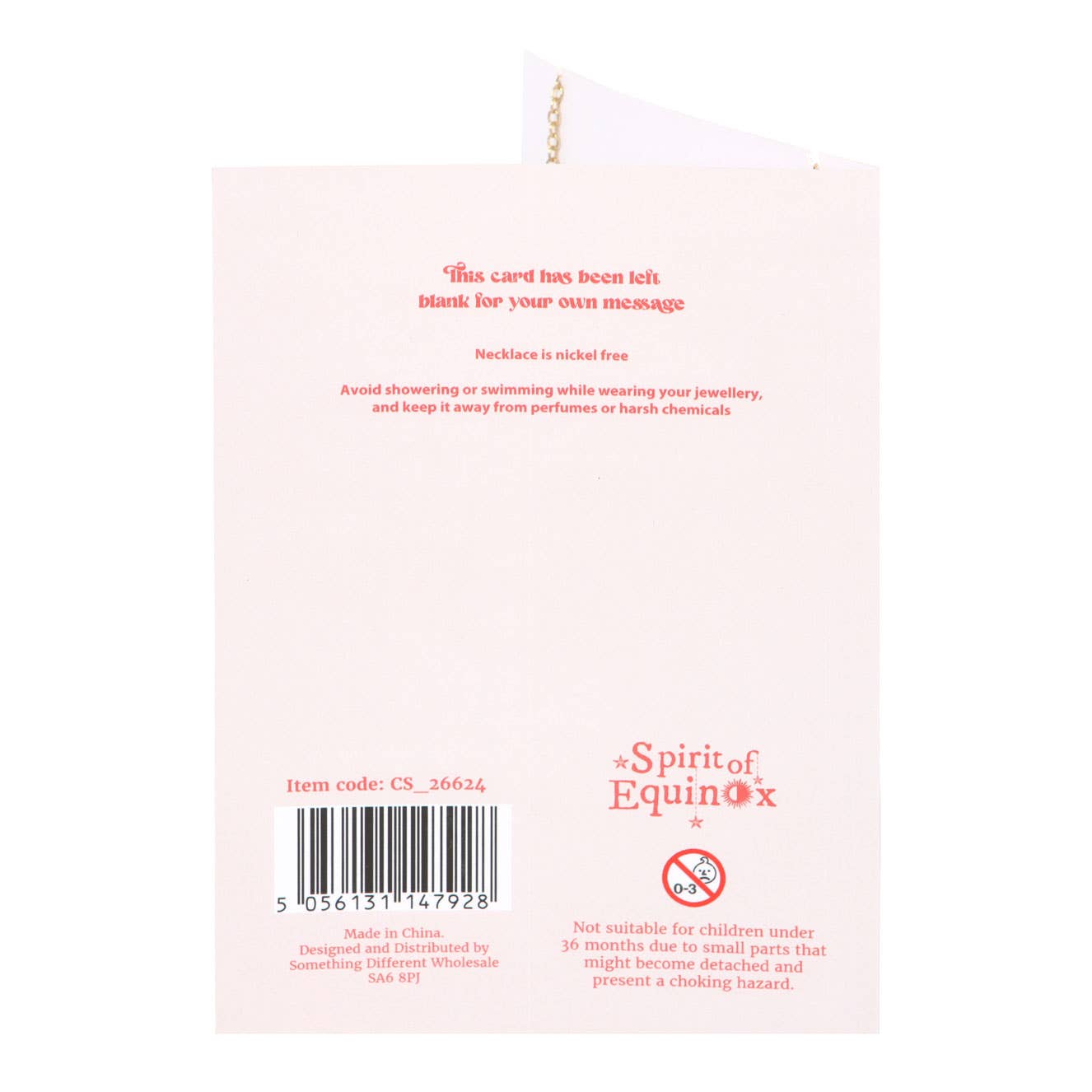 The perfect gift for expressing love and gratitude. This stainless steel necklace features a sun pendant with a rose quartz crystal. Presented on a colourful greeting card inspired by 'The Sun' tarot card designs, and text describing the benefits of rose quartz: "The stone of unconditional love. Restores trust and encourages love, respect and self-worth".