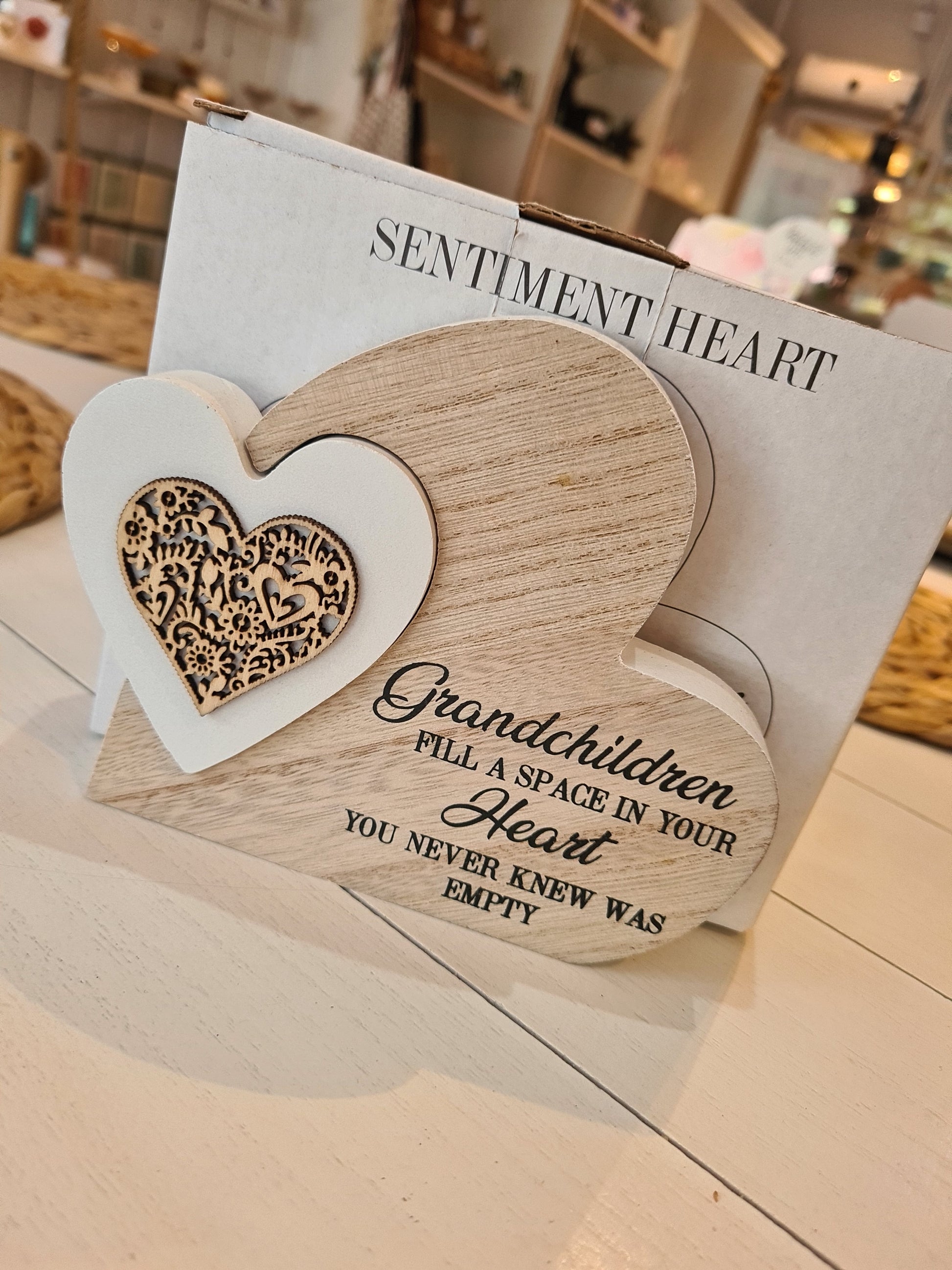 Set with a smaller white block heart fitting and script "Grandchildren fill a space in your heart you never knew was empty" quote, this charming home accessory will fit well with any interior theme