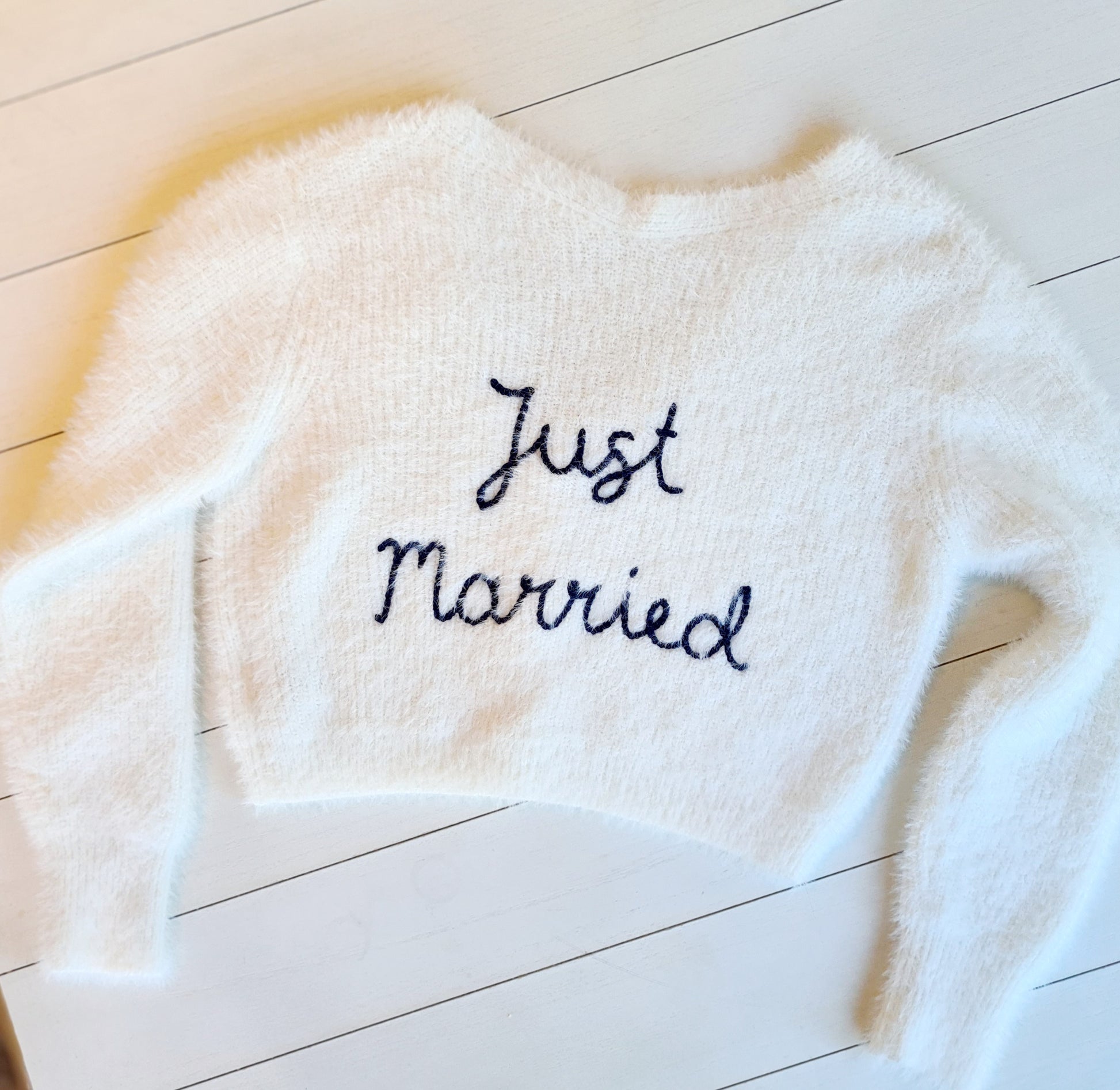 Hand stiched cardigan, with 'Just Married' hand stiched on the back.